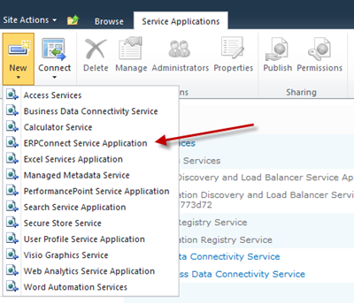 Theobald Software is providing an evaluation version that can be downloaded from their website. Installing the ERPConnect Services on a SharePoint 2010 server is done by an installer and is straight forward. The SharePoint Administration Service must run on the local server (see Windows Services). For more information see product documentation. After the installation has been successfully processed navigate to the Service Applications screen within the central administration (CA) of SharePoint: