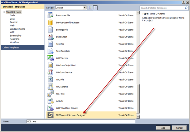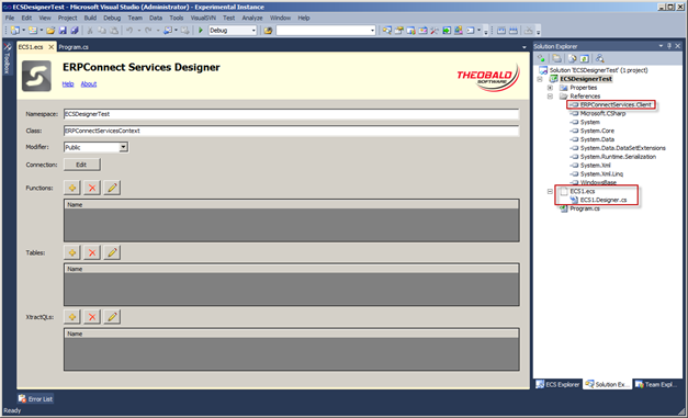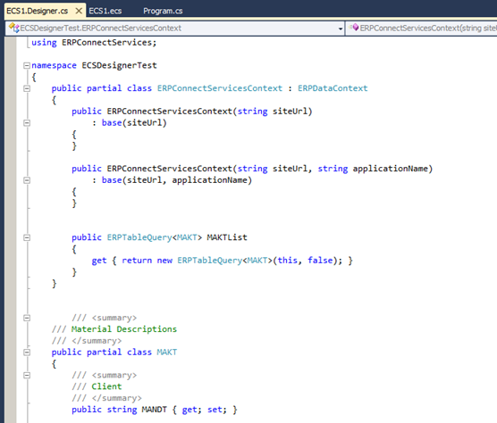 The ECS Designer is not automatically installed once you install the ERPConnect Services suite. You need to call the installation program manually. The setup adds a new project item type to Visual Studio 2010 with the file extension .ecs and is linking it with the ECS Designer. The needed references are added automatically after adding an ECS project item. The designer generates source code to integrate with the ERPConnect Services runtime after the project item is saved. The generated context class contains methods and sub-classes that represent the defined SAP objects (see screenshots below).
