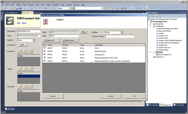 The screenshot above for instance shows the tables dialog. After clicking the Add (+) button in the main designer screen and searching a SAP table in the search dialog, the designer opens the tables dialog. In this dialog you can change the name of the generated class, the class modifier and all needed properties (fields) the final class should contain. To preview your selection press the Preview button. The next screenshot shows the automatically generated classes in the file named EC1.Designer.cs: