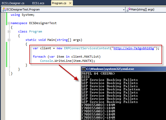 Using the generated code is simple. The project type we are using for this sample is a standard console application, therefore the ECS Designer is referencing the ERPConnectServices.Client.dll for desktop applications. Since we are not within the SharePoint context, we have to define the URI of the SharePoint system by passing this value into the constructor of the ERPConnectServicesContext class.