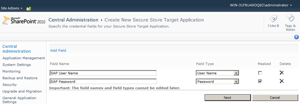 Before creating your first ERPConnect Service Application a Secure Store must be created, where ERPConnect Services will save SAP user credentials. There will be a SNC (Secure Network Communication) option for Single-Sign-On (SSO) scenarios starting with the next product version. In the settings page for the “Secure Store Service” create a new Target Application and name the application “ERPConnect Services”. Click on the button “Next” to define the store fields as follows: