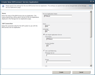 Click the “ERPConnect Service Application” link in the “New” menu of the Service Applications page (see also first screenshot above). This opens the “Create New ERPConnect Service Application” dialog to define the name of the service application, the SAP connection data and the IIS application pool:
