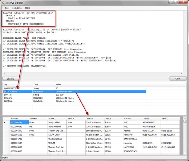 This query executes the SAP function module SD_RFC_CUSTOMER_GET and returns as result the table CUSTOMER_T (defined as @RETVAL).