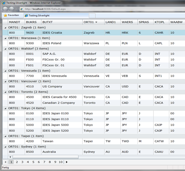 The following code sample shows a simple query of the SAP table T001 within a Silverlight client. First of all, an instance of the ERPConnectServiceClient is created using the URI of the ERPConnectService.svc, then a delegate is defined to handle the complete callback. Next, the query is executed, defined with a RowCount equal 10 to only return the top 10 records in the result set. Once the result is returned the data set will be attached to a DataGrid control (see screenshot below) within the callback method.