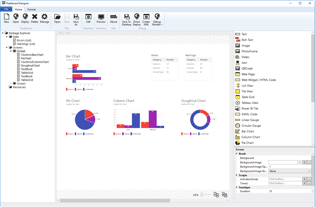 For the runtime I have developed a custom web server and administration website to upload and manage Peakboard packages containing the board and all of it's screen definitions and resource files. Each board can be directly deployed from the Peakboard designer application.