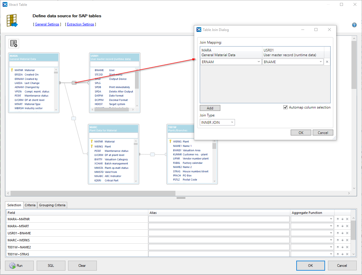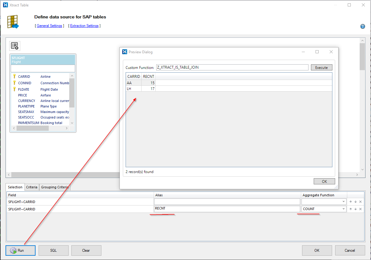 For the SAP side I developed a custom BAPI function module (Z_XTRACT_IS_TABLE_JOIN) that is processing the join defintion by generating a dynamic SAP Open SQL statement (INNER and OUTER JOINS). The function module also supports data packaging (with a definable package size) for regular queries as well as queries with aggregate functions like AVG, COUNT, MAX, MIN and SUM.
